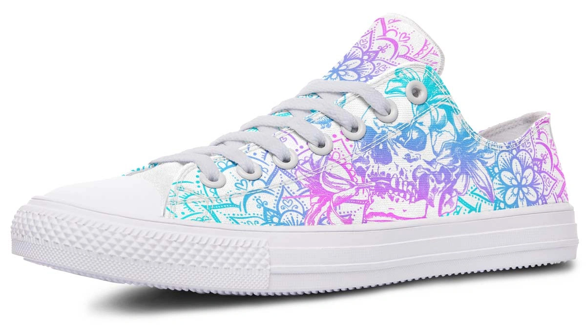 Discover the perfect balance of beauty and edge with Lily Flower Skull Low-Top Sneakers. Elegant floral patterns meet bold skull motifs for a unique look.
